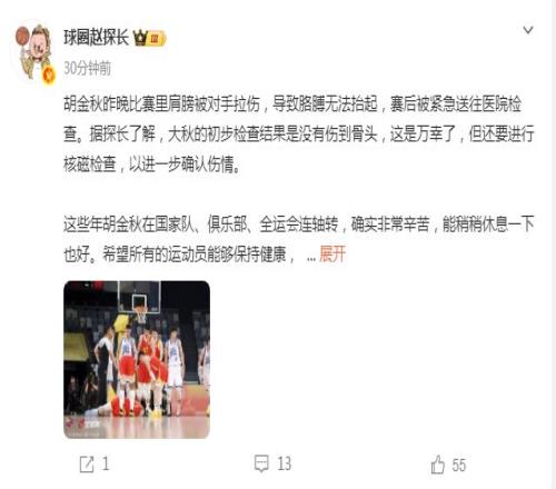 胡金秋傷情出爐:初步檢查胳膊沒有傷到骨頭還需進(jìn)行核磁確認(rèn)