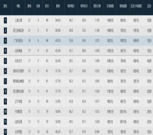 上海隊(22-4)、廣廈隊(21-5)、廣東隊(18-8)、山東隊(17-9)、北京隊(17-9)、深圳隊(15-11)、青島隊(15-11)、浙江隊(15-11)、遼寧隊(14-12)、寧波隊(13-13)、山西隊(13-13)和北控隊(12-14)。