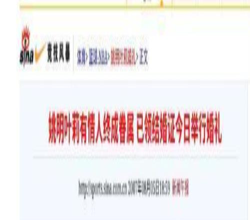 參考資料:《新聞午報(bào)》2007年8月7日刊發(fā)報(bào)道《姚明葉莉有情人終成眷屬 已領(lǐng)結(jié)婚證今日舉行婚禮》