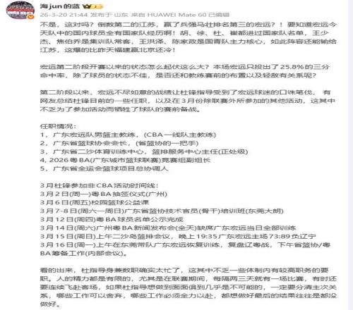 更深層的問題,是杜鋒的精力分散。媒體人“海jun的藍”披露,其身兼五職:廣東宏遠主教練、廣東省籃協(xié)會長、二沙中心籃排服務中心主任、粵BA競賽組副組長、省全運會籃球總協(xié)調人。僅三月,他便參與粵BA抽簽、公益課、技術培訓、新聞發(fā)布會等多場活動,甚至在3月14日缺席球隊全天訓練,次日即遭遇73-89負于遼寧。