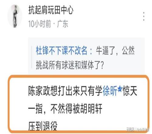 “把誰換下來呢?把誰的時間調(diào)少一點合適呢?”,杜鋒的這番話,賽后引起了眾多廣東球迷的不滿,紛紛在網(wǎng)絡平臺留言。“把你的時間調(diào)少一點,趕緊執(zhí)包袱過主啦”;“張浩嘉:簽對了公司底氣就是足。”;“陳家政想打出來只有學徐昕驚天一指,不然得被胡明軒壓到退役 ”。