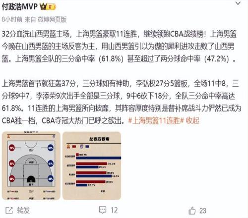 賽后多位媒體人發(fā)文稱贊了上海隊,賈磊表示:上海隊在山西主場拿到了一場碾壓級別的勝利;付政浩則干脆直言:11連勝的上海男籃所向披靡,其陣容厚度特別是替補席戰(zhàn)斗力儼然已成為CBA獨一檔,CBA奪冠大熱門已呼之欲出。