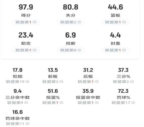 數(shù)據(jù)顯示,上海隊(duì)場(chǎng)均得分97.9、籃板44.6、助攻23.4、封蓋4.4、投籃命中率51.6%以及限制對(duì)手投籃命中率35.9%均傲視群雄;