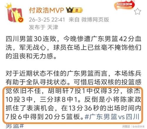 賽后,媒體人付政浩MVP社媒發(fā)文,除了對胡明軒、徐杰的表現(xiàn)進(jìn)行了點評,對陳家政給予了高度評價:對于近期狀態(tài)不佳的廣東男籃而言,本場練兵有助于全隊尋找狀態(tài)??上Ш髨鲭p核的投籃感覺依舊不佳,7投1中僅得3分,徐杰10投3中,三分球8中1。反倒是小將陳家政抓住了表演機(jī)會,在13分36秒的出場時間內(nèi),7投6中得到20分5籃板。