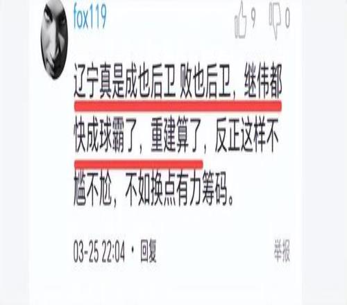 球迷說(shuō),誰(shuí)給你的信心?瘋狂打鐵為何不收手?為何繼續(xù)浪投?球迷說(shuō)得也有道理。如果趙繼偉在命中率低的情況下,能有意識(shí)地減少出手,多給隊(duì)友創(chuàng)造機(jī)會(huì)也許不會(huì)輸?shù)舯荣悺G蛎耘瓏?,“遼寧真是成也后衛(wèi)敗也后衛(wèi),繼偉都快成球霸了,重建算了”,還有球迷調(diào)侃:14中1,吉林慶功宴紀(jì)委不動(dòng)筷子都不能吃。確實(shí),趙繼偉成了吉林隊(duì)的臥底。