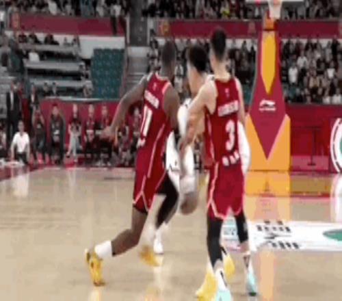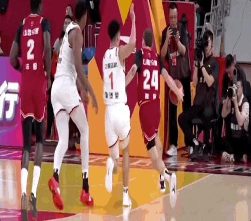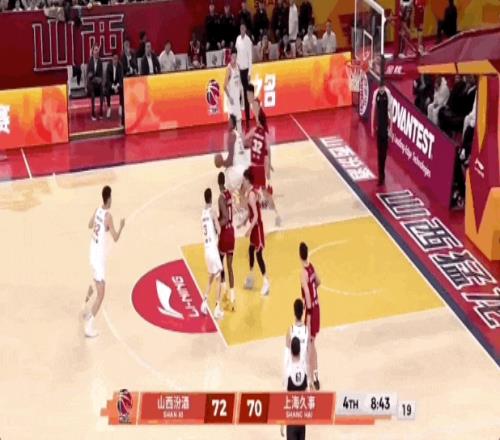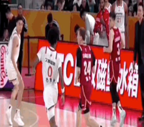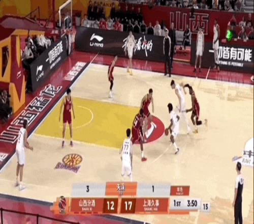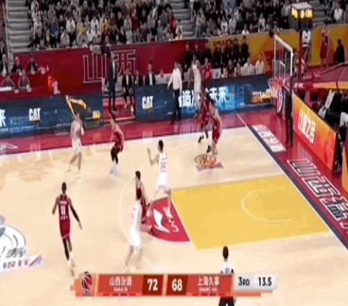 第三節(jié)上海男籃的最后一攻,李添榮開邊線球,古德溫外線接球,面對迪亞洛,干拔三分不進(jìn),懷特塞德拿到籃板,傳給李添榮,直塞籃下劉禮嘉,后者成功吃餅。
