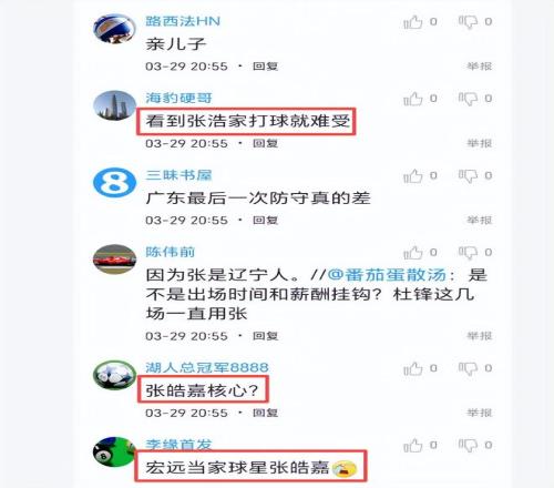 賽后廣東球迷質問杜鋒,“張皓嘉表現(xiàn)那么垃圾,為何打那么多時間?到底與張皓嘉是什么關系?”、“為何最近兩場連續(xù)讓他打首發(fā),且?guī)缀跏谴驖M全場”。也有球迷嘲諷說,你杜鋒是不是把張皓嘉當成核心了?“看到張浩家打球就難受”。張皓嘉上一場比賽表現(xiàn)也非常糟糕,打了30分鐘才得5分,顯而易見,杜鋒完全是亂用人,打這樣的弱隊,徐杰就不應該打這么多時間,而表現(xiàn)非常差的張皓嘉也不應該打這么多時間,而是分攤一些時間給黃明依,總之杜鋒今天的用人和輪換,廣東球迷非常不爽。你們說呢?