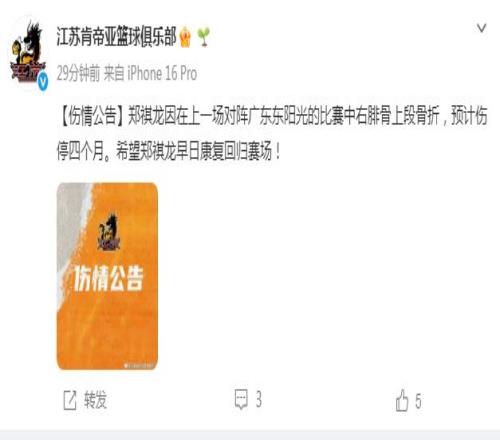 賽季報(bào)銷!江蘇男籃官宣:鄭祺龍右腓骨上段骨折預(yù)計(jì)傷停4個(gè)月