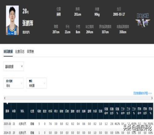 根據(jù)CBA官方的公示,張鵬琿今年只有21歲,身高2米01,臂展2米07,助跑起跳摸高350CM。在北京同檔次的年輕球員當(dāng)中,靜態(tài)條件比較出色。