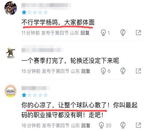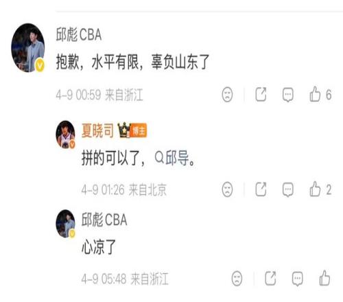 上一輪山東以6分之差惜敗廣廈的賽后,邱彪在社媒表示:“抱歉,水平有限,辜負(fù)山東了?!鄙綎|媒體人回復(fù):“拼的可以了,邱導(dǎo)?!钡癖氲幕貞?yīng)是:心涼了。