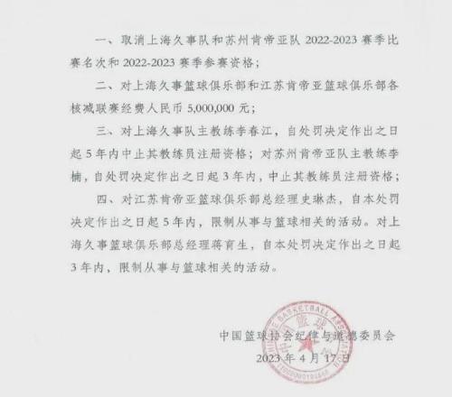 2023年季后賽上海隊VS江蘇隊系列賽,中國籃協(xié)認定兩隊在G2和G3出現(xiàn)“消極比賽”情況,因此時任上海隊主帥李春江被取消五年內(nèi)的教練員注冊資格,以及時任江蘇隊主帥李楠被取消三年內(nèi)的教練員注冊資格。