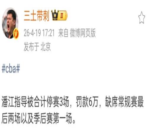本賽季的山西男籃可以說(shuō)是一言難盡,特別是主帥潘江被球迷詬病,然而就在常規(guī)賽結(jié)束階段,潘江卻收到了罰單,由于在山西男籃客場(chǎng)和江蘇男籃的比賽中辱罵裁判,潘江被禁賽3場(chǎng),也就是說(shuō),附加賽第一場(chǎng)潘江也會(huì)缺席。
