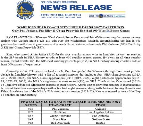 除此之外,科爾僅用943場比賽達成600勝,創(chuàng)造NBA歷史第4快紀(jì)錄。
