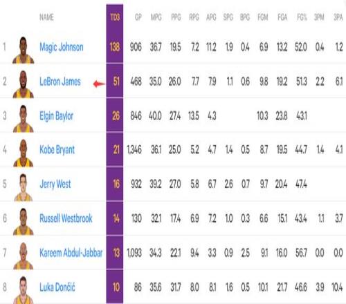 4.詹姆斯湖人隊(duì)史第51次三雙僅次于魔術(shù)師138次;