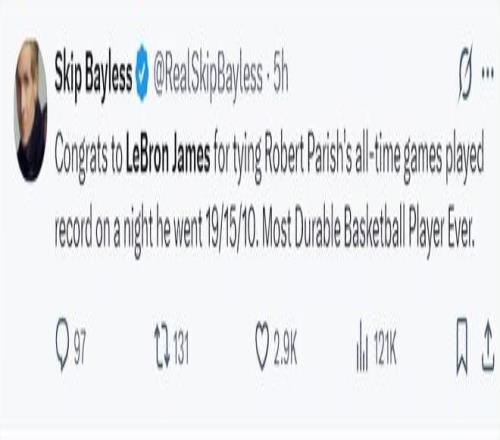 賽后最強(qiáng)詹黑斯利普-貝勒斯都被打服了,他寫道:恭喜勒布朗打破了帕里什的生涯出場次數(shù),他拿到19+15+10。他是有史以來最頑強(qiáng)的籃球運(yùn)動(dòng)員之一。