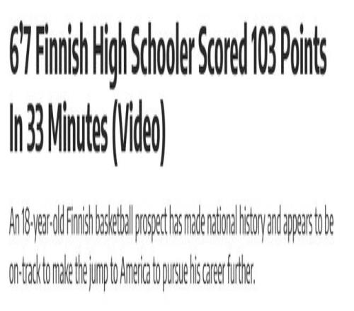 單場(chǎng)轟103分!18歲新星打破芬蘭籃球歷史紀(jì)錄:夢(mèng)想是打進(jìn)NBA