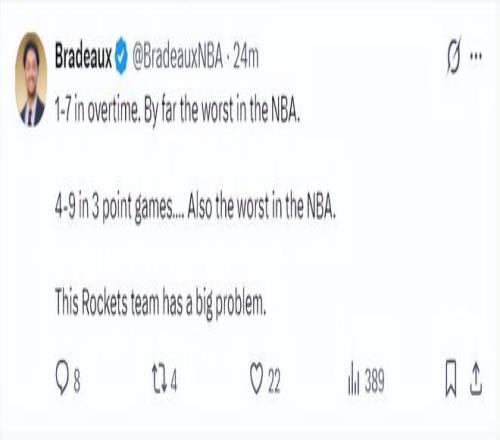 火箭記者Bradeaux寫(xiě)道:加時(shí)賽1勝7負(fù)這是NBA最差戰(zhàn)績(jī)了,三分球也是聯(lián)盟最糟糕的,這就是火箭的癥結(jié)所在。