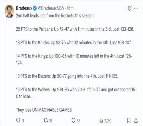 他繼續(xù)寫(xiě)道:火箭隊(duì)本賽季在下半場(chǎng)領(lǐng)先的比賽已經(jīng)輸?shù)舻谖鍒?chǎng):