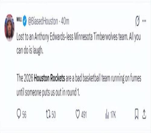 休媒:火箭輸給了沒(méi)有愛(ài)德華茲的森林狼,你能做的只是苦笑。2026年的火箭一直狀態(tài)不佳、瀕臨崩潰,直到有人在首輪就淘汰我們才行。