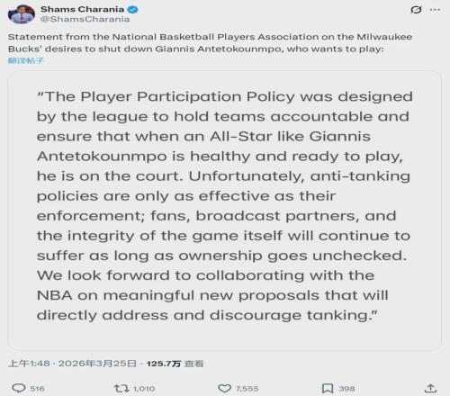 字母哥連續(xù)10年打進季后賽,如今被終結(jié)。字母哥仍在嘗試復(fù)出,關(guān)于是否賽季報銷的問題,他跟雄鹿管理層已經(jīng)鬧翻。今年3月25日,球員工會發(fā)表聲明:“反對雄鹿讓字母哥賽季報銷!我們要確保他這樣的球星在健康時能夠出戰(zhàn)。”