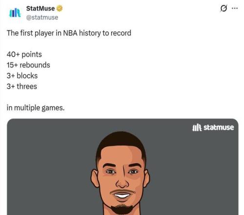 這讓文班成為NBA歷史上首位單場拿下至少40分+15板+3記三分+3記蓋帽的球員。