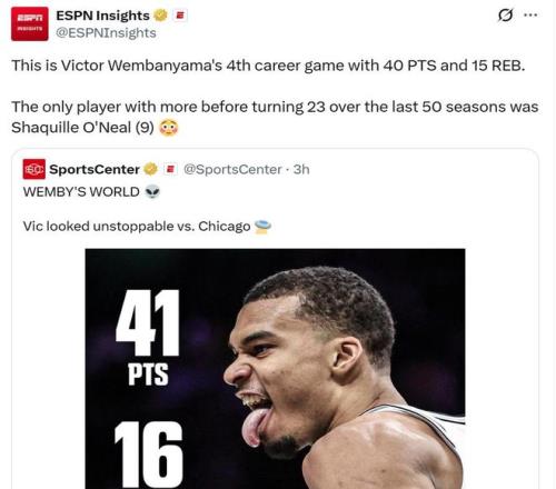 這讓文班亞馬成為NBA近50年來,第二位在23歲前4次拿下至少40分15板的球員,僅次于奧尼爾的9次。