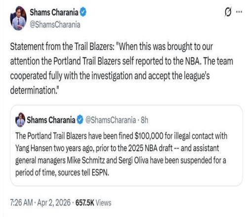 消息最先由Shams曝出,開拓者因兩年前(2023年12月)與楊瀚森違規(guī)接觸被罰款10萬美元。