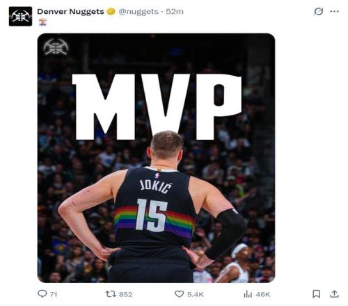 這場比賽后掘金官方曬出了約基奇的背影打上了MVP的標簽,這就是掘金官方力挺的MVP。這個MVP有兩層含義,第一層是本場MVP,第二層是力挺約基奇當選本賽季常規(guī)賽的MVP。