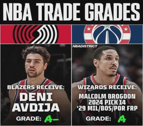 2024年夏天,開拓者送出布羅格登+首輪第14號秀卡林頓+29年首輪簽+2個(gè)次輪簽,以此從奇才挖來阿夫迪亞。