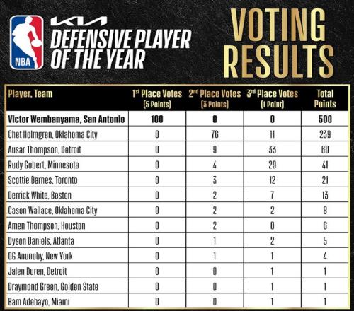 文班亞馬進入聯(lián)盟3個賽季,完成了3連蓋帽王的壯舉,卻連續(xù)兩年與DPOY失之交臂——2023-24賽季,文班亞馬在DPOY爭奪戰(zhàn)中188分慘敗給法國老鄉(xiāng)戈貝爾,文班亞馬曾放下狠話:就讓他現(xiàn)在贏吧,因為以后就輪不到他了;2024-25賽季,文班亞馬因血栓賽季報銷僅出戰(zhàn)46場無緣評獎,小莫布里坐收漁利將DPOY收入囊中!本賽季,文班亞馬湊夠了65場評獎資格,打了個漂亮的翻身仗,作為對比,2023-24賽季DPOY戈貝爾僅拿到4張第二選票和29張第三選票,總得分僅為41分;2024-25賽季DPOY小莫布里沒有拿到任何一張選票,總得分為0!