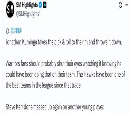 美媒SM Highlights曬出了一段庫明加借助擋拆沖擊籃下扣籃的視頻,毫不客氣地批評勇士主帥科爾:“喬納森?庫明加借擋拆直沖籃下,完成暴力扣籃。勇士球迷看這一幕大概都不忍直視,心里都清楚,他本可以身披勇士戰(zhàn)袍打出這般表現(xiàn)。自從那筆交易之后,老鷹一躍成為聯(lián)盟頂級強(qiáng)隊(duì)之一。史蒂夫?科爾又一次在年輕球員的抉擇上看走了眼?!?/p>