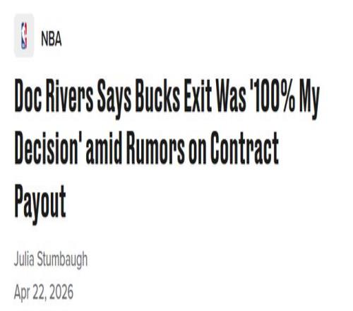 2025-26賽季,雄鹿僅取得32勝50負(fù)的戰(zhàn)績(jī)、無(wú)緣季后賽,球隊(duì)與字母哥的矛盾也公開激化,在此背景下,里弗斯選擇離任。