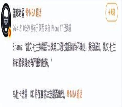 據(jù)記者Shams最新披露,杜蘭特的傷勢(shì)源于上周三(4月15日)的一次隊(duì)內(nèi)訓(xùn)練。當(dāng)時(shí)他在一次拼搶地板球時(shí),與隊(duì)友發(fā)生非對(duì)抗性碰撞,右膝瞬間腫脹、疼痛加劇,無法完成正常屈伸。賽后影像檢查排除結(jié)構(gòu)性損傷,但疼痛持續(xù),導(dǎo)致他缺席G1?;鸺?duì)醫(yī)療組起初評(píng)估為“輕度軟組織反應(yīng)”,樂觀預(yù)計(jì)他可能在G2復(fù)出,但最終決定權(quán)完全交予杜蘭特本人。