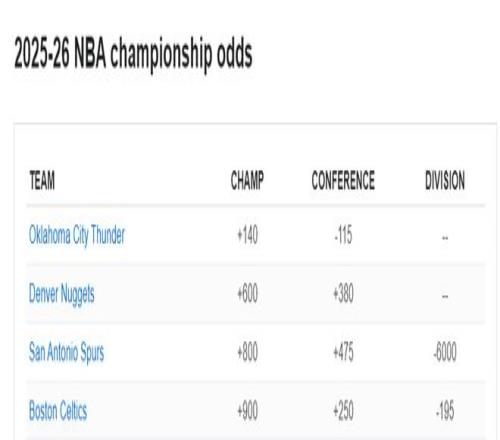 ESPN預(yù)測的奪冠賠率也更新,雷霆+140、綠凱+600、馬刺+800,馬刺也已經(jīng)升第三。