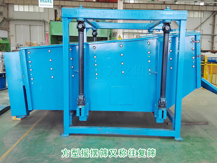 方型搖擺篩又稱(chēng)往復(fù)篩,其驅(qū)動(dòng)裝置所產(chǎn)生的振動(dòng)力是一繞定軸、方向呈一定規(guī)律變化的慣性力,其本質(zhì)是由偏心輪繞定軸轉(zhuǎn)動(dòng)所形成的往復(fù)慣性力。篩機(jī)啟動(dòng)后,篩機(jī)搖動(dòng)體即篩箱在慣性力的作用下作前后往復(fù)運(yùn)動(dòng),篩箱帶動(dòng)篩面作周期性搖動(dòng),從而使篩面上的物料隨篩箱一同作定向跳躍式運(yùn)動(dòng),期間,小于篩面孔徑的物理通過(guò)篩孔落到下層,成為篩下物,大于篩面孔徑的物料經(jīng)連續(xù)翻滾跳躍運(yùn)動(dòng)后從排料口排出,完成篩分工作。