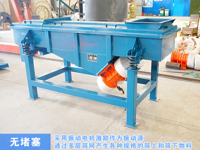 直線(xiàn)振動(dòng)篩采用振動(dòng)電機(jī)激勵(lì)作為振動(dòng)源,使物料在篩網(wǎng)上拋起,同時(shí)直線(xiàn)前進(jìn)。物料從進(jìn)料器均勻進(jìn)入篩選機(jī)進(jìn)料口,通過(guò)多層篩網(wǎng)產(chǎn)生各種規(guī)格的篩上和篩下物料,分別從各自的出口排出,不存在堵塞現(xiàn)象,產(chǎn)量高。
