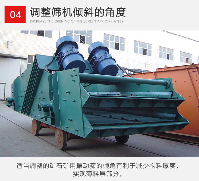 礦用振動篩在設計傾角時通常情況下為45°,但在實際使用過程中如果物料中雜質少只需粗篩一下就行的時候用戶可以適當調節進料口下部的振動彈簧高度,使進料口高度升高就可以加快物料在篩面的運動從而提高產量。