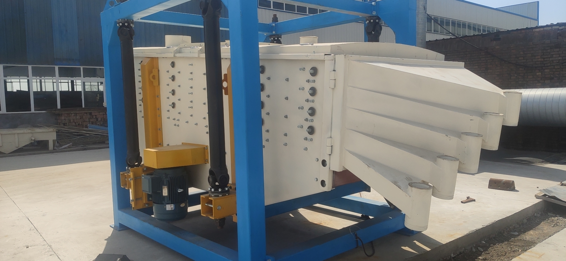 進料口改變了原來依附在后門上的設計,增加分料板結構使進料也越發簡單快捷、分料更有效均勻,觀察孔用來控制物料篩分精度和堵網情況;出料口位于方形搖擺篩斜下方,可以根據客戶的物料篩分需要進行各種不同設計通過改變出料口的角度、長度、料管直徑等方式,適應各種性狀物料流出篩體。