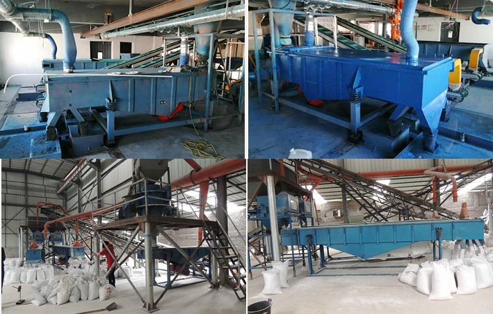 塑料顆粒通過輸送帶進入多層直線篩設備,由于電機激振力和自身重力的雙重作用,塑料顆粒沿直線篩面直線跳躍,上層塑料顆粒在上排料口被篩出,而小于篩網目數的塑料顆粒進入下部篩網,仍沿同一物料運動軌跡。經過三層篩網后,塑料顆粒分為大于2.5mm塑料顆粒、2.5mm-1.4mm塑料顆粒、1.4mm-80目塑料顆粒、小于80目塑料顆粒等四種規格的材料,還可根據要求選擇6層不通目數的篩網,以實現要求的分級效果。