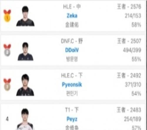 電競體育4月9報(bào)道 跟韓服排位統(tǒng)計(jì)小程序顯示,Zeka再次登頂韓服第一。