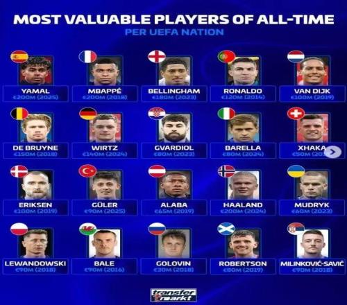 而在歐洲各家國家隊球員歷史身價排行榜中,西班牙國家隊、法國、挪威均是2026年度身價2億球員領(lǐng)跑,英格蘭身價最高的貝林厄姆,他目前身價為1.8億歐,葡萄牙則是2014年時期的C羅,當(dāng)時他的身價為1.2億歐。此外,荷蘭的范戴克在2019年以1億歐領(lǐng)跑,比利時則以2018年時身價高達(dá)1.5億歐德布勞內(nèi)領(lǐng)銜,德國隊歷史最高身價則是由2024年的維爾茨保持,當(dāng)時他的身價高達(dá)1.4億歐,丹麥的記錄則由埃里克森保持,當(dāng)時他的身價為1億歐。值得關(guān)注的是,除了上述國家隊外,其他國家隊歷史最高身價均未超過1億歐。