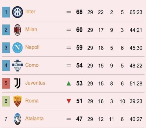 隨著大黑馬21羅馬+AC米蘭01爆冷!意甲最新積分榜:25名差7分