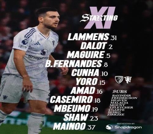 曼聯(lián)首發(fā):31-拉門斯、2-達洛特、15-約羅、5-馬奎爾、23-盧克-肖、37-梅努、8-B費、18-卡塞米羅、16-迪亞洛、10-庫尼亞、19-姆伯莫