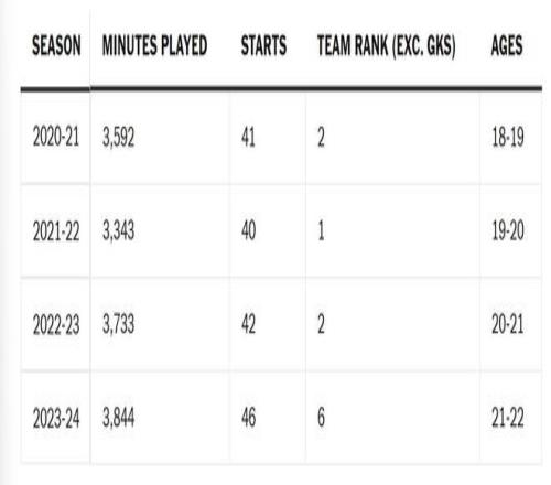 只有薩卡自己知道他的身體感受如何,但不可否認(rèn)的是,他一直被要求扛著阿森納前行。在2024年12月腿筋受傷之前,從他18歲到22歲的四個賽季里,有三個賽季他都位列俱樂部外場球員出場時間的前兩名。