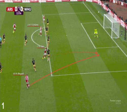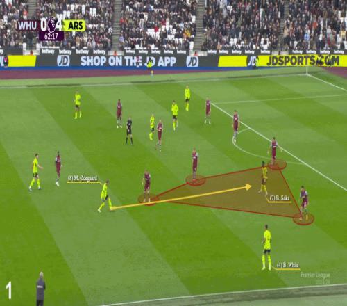 在下圖所示的2024年11月戰(zhàn)勝西漢姆聯(lián)的比賽中,厄德高從縱深位置送出傳球,本-懷特提供了自然的寬度,薩卡則游弋到了中路區(qū)域。他一次觸球擺脫西漢姆后衛(wèi),再一腳觸球完成射門。干凈利落。