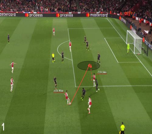當(dāng)阿森納和薩卡處于最佳狀態(tài)時,這些傳球通常是從內(nèi)側(cè)傳入,這樣他可以在已經(jīng)朝向球門移動的過程中接球。通常是懷特從更靠邊的位置送出這類傳球,如下圖所示,在10月1-0戰(zhàn)勝水晶宮的比賽中。