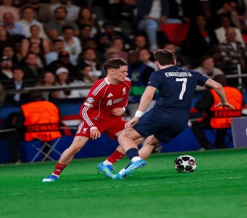 第32分鐘,利物浦解圍不力,克瓦拉茨赫利亞迎球打門被馬馬爾達(dá)什維利撲出;第37分鐘,大巴黎后場(chǎng)長傳高效反擊,門德斯卸球無私橫傳,杜埃絕佳機(jī)會(huì)單刀被出擊被馬馬爾達(dá)什維利化解;1分鐘后,克瓦拉茨赫利亞換邊到右路面對(duì)凱爾凱茲防守自信起腳擊中了邊網(wǎng)。整個(gè)上半場(chǎng),利物浦竟然沒有完成任何一次射門,控球率更是只有25%;場(chǎng)面上完全被大巴黎牽著走。