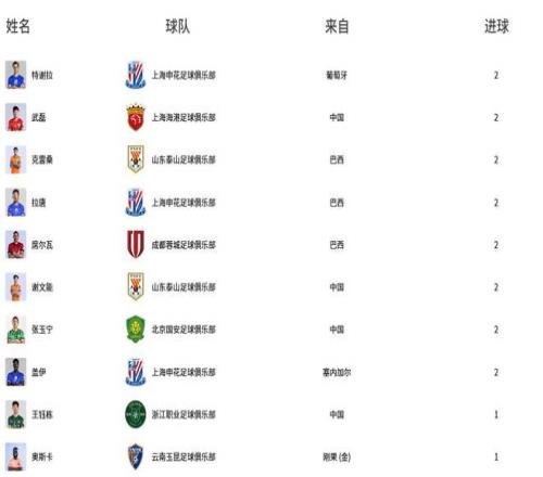 根據(jù)中超官網(wǎng)數(shù)據(jù),兩輪比賽過后,積分榜前十名中前八位球員均打入兩球,競(jìng)爭(zhēng)異常激烈。其中,泰山隊(duì)成為最大亮點(diǎn),克雷桑以及謝文能憑借在本輪比賽中的出色發(fā)揮成功上榜。