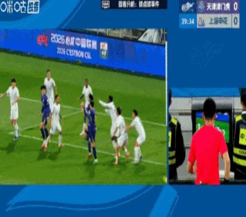 然而,就在此時,主裁判收到了VAR的提示,在之前津門虎的那次角球進攻中,申花外援蓋伊伸開手臂阻擋了來球,主裁判何鑫觀看回放后過段判罰了點球。