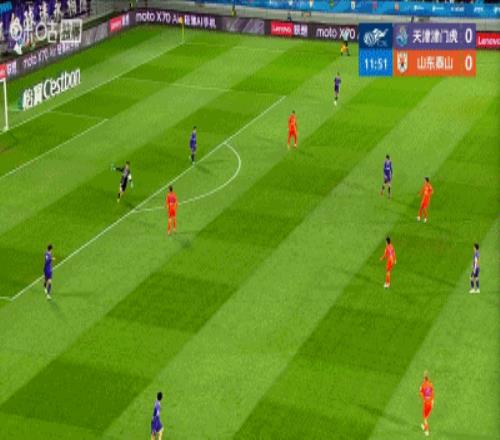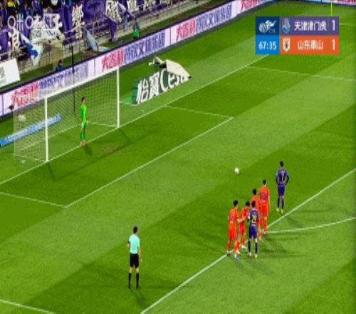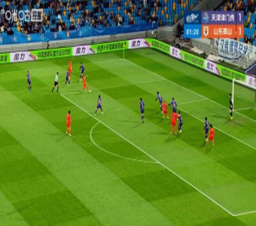 第52分鐘,陳蒲左路傳中,澤卡頭球沖頂破門,泰山1-1扳平津門虎!